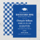 Invite friends and family with this blue graduation party invitation featuring a bold “Backyard BBQ” headline, graduation cap icon, and clean rustic typography. Perfect for a casual cookout, open house, or summer backyard celebration. Backside features a coordinating royal blue and white gingham pattern for a classic picnic vibe. Personalize with your graduate’s name and party details.