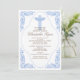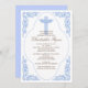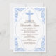 Start your event off right with our elegant blue antique frame featuring delicate flourishes with a blue cross set on a white background. Baby boy baptism / christening invitation. Easy to customize, just add your event information and you're all set to go.