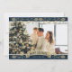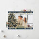 Elegant blue photo Happy Holidays card featuring gold holly with berries on the front and a watercolor painting of poinsettia, holly and red berries at the back.