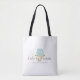 An elegant pastel blue tiered cake decorated with white flowers sits atop a faux gold cake stand for a beautiful aesthetic on this bakery-themed personalized tote bag. Perfect for bakers, catering companies, cake decorators, or for personal use. Design © 1201AM Design Studio