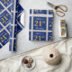 This simple and elegant wrapping paper design features a personalized message like "Andrew’s 21st Birthday" (with the "21st" having a faux/imitation gold-like colouring look) within a blue-coloured square area featuring a simple border outline. The name is in an elegant white-coloured script-like text, and can be customized. Wrapping paper like this could perhaps be used when wrapping birthday gifts for somebody who is celebrating their twenty first birthday. [~Z0000221]