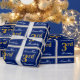 This simple and elegant wrapping paper design features a personalized message like "NameHere’s 3rd Birthday" (with the "3rd" having a faux/imitation gold-like colouring look) within a blue-coloured square area featuring a simple border outline. The name is in an elegant white-coloured script-like text, and can be personalized. Wrapping paper like this could perhaps be used when wrapping birthday gifts for somebody who is celebrating their third birthday. [~Z0000221]