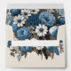 The colour palette combines various shades of blue, from deep navy to powder blue, accented with crisp whites and warm brown tones in the leaves and stems. This creates a harmonious and eye-catching design that's both romantic and modern. The cream background provides a neutral, sophisticated base that allows the floral elements to stand out.