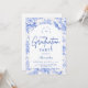 An elegant graduation celebration design featuring a delicate blue toile floral border inspired by classic European porcelain and vintage botanical prints. The intricate florals frame a clean arched center panel, creating a refined and timeless composition that highlights the graduate’s name and event details beautifully. Soft blue tones against a crisp ivory background give the design a sophisticated yet celebratory feel. Perfect for a stylish graduation gathering with a classic, romantic aesthetic.