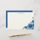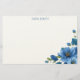 This personalized stationery card is engineered with a minimalist aesthetic to facilitate professional and high-touch personal correspondence. The design features a clean white canvas that prioritizes ample white space for handwritten messaging, anchored by a sophisticated floral graphic in the lower-right quadrant for visual interest. A centered, serif-typeface header provides immediate brand or individual identification, while the matching solid blue envelope reinforces a cohesive and premium brand identity.