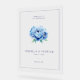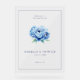 This elegant wedding sign features a centered floral illustration of a detailed peony flower in shades of blue, set against a muted gray background. The design uses a sophisticated serif font for the welcoming message and event details, creating a classic and formal look. With its serene color palette and balanced layout, this sign conveys an atmosphere of elegance and tranquility, perfect for celebrating a special moment. The customizable text allows you to personalize it for your own wedding celebration.