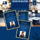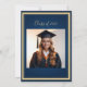 Cette image est une invitation à la fête de remise de diplômes sur le thème du bleu et de l'or. Il comporte d'élégantes polices de script or, un petit graphique de casquette de graduation, et comprend des espaces réservés pour le nom du diplômé, l'école, l'année de classe, la date de l'événement, l'heure, l'emplacement, les détails RSVP, et une photo au dos. Le design a un ton formel et festif. Personnaliser pour une touche personnelle !