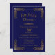 An elegant customizable blue with gold ornate lace 30th birthday dinner invitation.