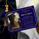 Elegant blue graduation party invitation featuring a refined scalloped photo panel on the left and personalized event details on the right, all framed by a genuine gold foil double scalloped-edge border. This landscape-oriented foil invitation offers a timeless, sophisticated look ideal for celebrating high school, college, or university graduates. Fully customizable with the graduate’s photo, name, degree, date, and event details, this polished design creates a memorable keepsake for honoring an important milestone. Composite design by Holiday Hearts Designs (rights reserved).