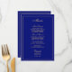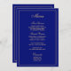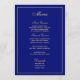 An elegant way to show your guests their menu options. In a mid tone royal blue with gold writing. An elegant script wedding font has been combined with a modern style all caps font creating a stylish, yet user friendly wedding menu.