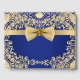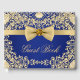 Blue and gold guest book with gold jewel bow on an elegant royal blue and gold swirl background. You can easily customize this beautiful royal blue and gold guest book for your event by simply adding the text of your choice in the font style you prefer. This is a printed design with no real bows, jewels, etc.