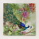 Jigsaw puzzle with the painting of an elegant blue and green peacock in a lush forest of pink floral and greenery.