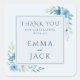 Add a romantic finishing touch to your celebration with this refined wedding sticker, featuring soft blue watercolor flowers and leafy green foliage artfully arranged in a timeless botanical frame. Your names are elegantly displayed in a classic serif font for a sophisticated, personalized accent. The pastel soft colour palette and rustic elegant style make this sticker perfect for garden party table decor, autumn wedding mementos, or as a vintage inspired thank you for your guests. Ideal for favours or keepsakes, its delicate design and blue floral detailing create a heartfelt expression of gratitude and thanks capturing the essence of romantic watercolor flowers and the joy of your special day, complete with your wedding date for a lasting remembrance.