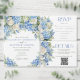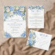 Elegant floral wedding design with watercolor-painted floral arrangements of blue hydrangea flowers, greenery, and white roses.