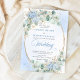Make your special day unforgettable with this elegant watercolor wedding invitation, thoughtfully designed to shine with Zazzle’s premium print quality. Featuring soft pastel blue hydrangeas, delicate eucalyptus and greenery foliage, and a refined gold glitter oval frame, this invitation blends timeless romance with modern sophistication.