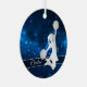 This elegant ornament features a silver silhouette cheerleader against a pretty blue background with tiny star lights. Her name is in silver on a semi transparent banner that is framed in white faux glitter. The back of the ornament has the same blue background with three custom text fields at the center. Perfect for that daughter, granddaughter, or niece who is a member of a cheer squad.