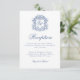 This formal elegant blue and white wedding reception enclosure card features a vintage crest with fancy script monogram initials of the bride and groom.