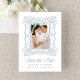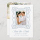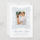 Announce your wedding with this elegant blue ornate frame photo save the date, featuring a hand-drawn antique picture frame surrounding the couple’s vertical engagement photo. “Save the Date” is displayed in graceful calligraphy, paired with classic serif lettering for the couple’s names, wedding date, and location for a polished, balanced look. The back features a horizontal engagement photo, with custom text and a scannable QR code shown below to direct guests to your wedding website. This personalized photo save the date blends refined design with modern convenience and offers a stylish way to share your wedding date.