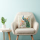 Elegant Blue Peacock Pink Flowers Cream Throw Pillow