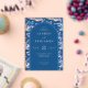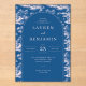 This elegant wedding invitation features a classic design with a deep navy blue central frame set against a detailed, monochromatic blue background of trees and buildings. The layout is symmetrical, showcasing the names "Lauren and Benjamin" in bold serif fonts, creating a focal point for the event details. The overall style exudes formality and sophistication, perfect for a traditional celebration, while the intricate illustrations add a touch of timeless charm. Ideal for couples seeking an inviting yet refined aesthetic, this design captures the essence of a memorable occasion.