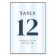 This elegant wedding table card features a clean, modern design with alternating light blue and white vertical stripes. The focal point is the bold, serif typography displaying the table number "12," complemented by the word "TABLE" at the top in a medium-weight serif font. Below, customizable text fields allow for personalization with names and dates in a simple sans-serif style. The overall aesthetic exudes sophistication and clarity, making it perfect for formal occasions like weddings.