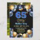 An elegant modern design featuring blue 65 number with gold edges and balloons with silver, blue and gold glitter and a special photo of the birthday person on the back of the invitation. Customize the details for a unique and chic Birthday Celebration.