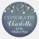 Elegant blue surprise retirement party stickers for envelope seals or gift favour bags, featuring shimmering string lights and a combination of script and open face typography on a dark blue ombre background graduating from lighter blue in the centre to darker blue on the outer edges for a soft shimmering atmospheric effect. Perfect for men's or women's retirement celebration.