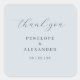 This wedding sticker features a minimalist and elegant design with a soft pastel blue background, creating a serene and sophisticated look. The layout is vertically oriented, showcasing the phrase "thank you" in flowing cursive script at the top, followed by two names and a date in uppercase serif font, all centered for a balanced appearance. The typography combines graceful script and formal serif fonts, conveying warmth and tradition. With its clean lines and ample negative space, this sticker exudes a timeless charm perfect for expressing gratitude at your special event.
