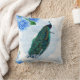 A regal peacock with blue floral and vintage elements on a white pillow. Very faint music notes can just be seen on the background. This is a timeless and elegant design that would suit many styles of home decor.