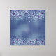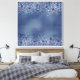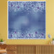 An elegant piece with blue background showing acrylic paint effect, decorated by tiny white dispersed particles and purple flowers.