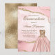 An elegant pink and gold themed Quinceanera invitation. This design features an elegant rose gold dress art over a marble agate art background. Please note, foil and glitter details are simulated.
