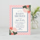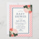 Elegant Floral Baby Shower invitation featuring blush roses, dark coral and yellow flowers, and green leaves with an off white centre and blue borders against a sweet blush coral gingham background on the front. Invitation has a blue back side. It's a perfect invitation for a girl or gender neutral baby shower. Check out baby shower items here https://www.zazzle.com/rosewoodandcitrus/gifts?cg=196748758771183969?rf=238364477188679314
