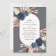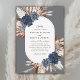 This beautiful, elegant wedding invitation features boho floral arrangements (including pampas grass) in opposite corners, with a white oval shape in the center. The color scheme consists of brown, navy blue, ivory, and beige. The background color can be customized to any color you'd like (shown in a blue-toned gray). The back of the card is a matching navy blue, but the color can be easily customized, if desired. For design or product inquiries, please feel free to reach out to me (Tracey) at orabellaprints@outlook.com.