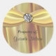Elegant round bookplate sticker, with graphics of a golden silk background. A pretty golden yellow satin ribbon goes across the top, with a diamond accent, in the middle. Text reads, Property of, Name. Personalize this great looking nameplate for yourself or as lovely gifts.