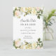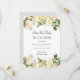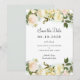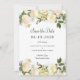Elegant chic botanical Save The Date card features romantic white vanilla wedding roses with hints of blush pink of displayed in leafy greenery on a timeless white background. Personalize wedding details for your guests in elegant charcoal grey lettering and script. The back of the card is soft green. Feel free to contact me at invitationsuites@gmail.com if you have questions regarding this or any of our designs.