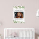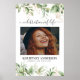 Memorial Print featuring a large photo of the person your remembering, elegant watercolor green botanical eucalyptus leaves, gold floral accents, their name, and birth/death dates.