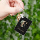 Elegant black keychain with a gold botanical monogram in the centre.
