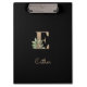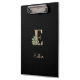 Elegant black clipboard features a gold botanical monogram in the centre.