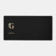 Elegant black desk mat features a gold botanical monogram in the centre.