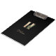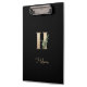 Elegant black clipboard features a gold botanical monogram in the centre.