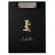 Elegant black clipboard features a gold botanical monogram in the centre.