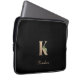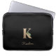 Elegant black laptop sleeve features a gold botanical monogram in the centre.