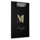 Elegant black clipboard features a gold botanical monogram in the centre.