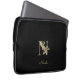 Elegant black laptop sleeve features a gold botanical monogram in the centre.