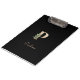 Elegant black clipboard features a gold botanical monogram in the centre.