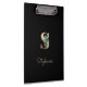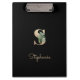 Elegant black clipboard features a gold botanical monogram in the centre.