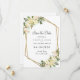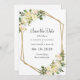 Elegant chic botanical Save The Date card features white vanilla romantic wedding roses with hints of blush pink of displayed in leafy greenery on a timeless white background. A sparkling golden colour geometric crystal-shaped frame provides a trendy touch. Personalize wedding details for your guests in elegant charcoal grey lettering and script. The back of the card is white. Feel free to contact me at invitationsuites@gmail.com if you have questions regarding this or any of our designs.