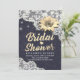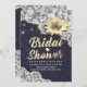 Modèle d'invitations de douches nuptiales - Fleurs de soleil élégantes, cadre de dentelle Vintage et lumières à cordes chic sur Arrière - plan bleu marine. Un Design Parfait Pour Votre Grand Jour ! Tous Les Style De Texte, Couleurs, Tailles Peuvent Être Modifiés En Fonction De Vos Besoins.
