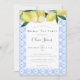 A bridal tea party shower invitation featuring yellow lemons, hand drawn in watercolor and colour pencils over a watercolor pattern of blue tiles inspired by the Mediterranean traditions. Personalize it with the name, the date, the time and all the details. Modern calligraphy for the bride's name.