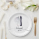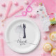 Celebrate your love story and express heartfelt gratitude with these charming "Thank You" plates, featuring a romantic watercolor illustration of a bride and groom mid-dance. With the bride in shimmering heels and a sparkling tulle dress, and the groom in classic formalwear, these plates capture the joy and elegance of your special day. The handwritten-style "thank you" script adds a personal, graceful touch.